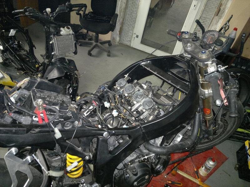Części jakie zamontowałem pochodzą z Suzuki GSXR 1000 K5 tj. zegary, kompletna wiązka instalacji i gardziele wtrysków, przednie zawieszenie pochodzi z K7 750.