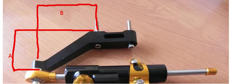 Chciałem sobie dorobić mocowanie amortyzatory skrętu do mojej CBR 929. Chodzi mi o mocowanie do górnej półki widelca. Związku z czym mam gorącą o prośbe do posiadaczy w/w mocowania o sprawdzenie i podanie mi wymiarów zaznaczonych na zdjęciu. Chodzi o odległość miedzy zaznaczonymi otworami (B) oraz różnice wysokości płaszczyzn (A). Dzięki za pomoc