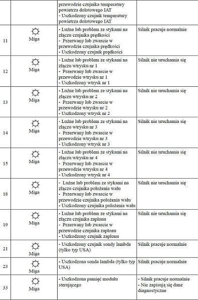 Czytasz to tak: gdy świeci się kontrolka bledu przez 3 sekundy to jest równoznaczne z dziesiątkami czyli jak mruga ci wolno raz to jest to rownoznaczne z 1_ , jak dwa razy to z 2_ i tak dalej, i po długich mrugnięciach zaczyna szybko mrugać i to oznacza jedności na przykład, 1 mrugnięcie jest długie a następnie dwa szybkie to oznacza błąd 12 i szukasz tego w tabeli, i tak odczytujesz kazdy inny błąd