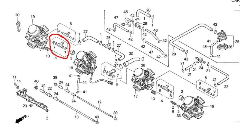 Rozłączał ktoś z Was gazniki w Sc33 ?, nie chodzi mi o ich przygotowanie do czyszczenia itp, tylko o ich calkowite oddzielenie - tak aby kazdy z nich było osobno. Problem w tym ze na jednej złączce w ksztalcie litery T, dostarczajacej do nich paliwo - zaznaczona na ponizszej fiszcze, padł najpewniej oring, i po dluzszym postoju kolezka ma problem z cieknacym paliwem - leje sie dokladnie z tej zlaczki. Jak maszyna jest odstawiona na kilka miesiecy, po odpaleniu dosc mocno leje z tego miejsca paliwem - po zgaszeniu oczywiscie przestaje, bo zaworek w kraniku zamyka doplyw paliwa. Co dziwne po takiej akcji, po odstaniu kilku godzin, uklad sam sie uszczelnia i jest idealnie az do kolejnego dlugiego postoju. Jesli koleszka lata minimum 1x w miesiacu nie ma tego problemu... najczesciej pojawia sie to po postoju zimowym.