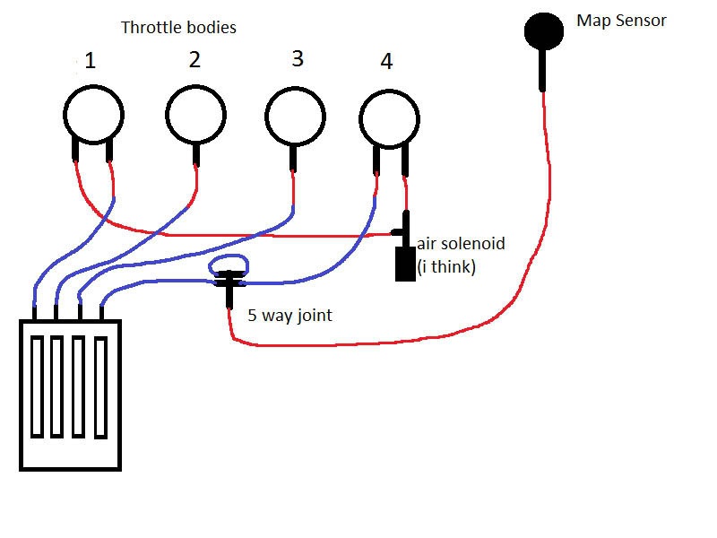 mam problem...moto dostaje zbyt dużo paliwa i na wolnych obrotach troche faluje. Chciałem wyregulować starter valves wg instrukcji która jest gdzieś tu na forum ale coś tam mi nie gra bo po wypieciu MAPa dostał błąd i mruga mi FI i generalnie kręcenie zaworami nie zmienia mi zbytnio podciśnień na 2 3 i 4 cylindrze. Zakładajac , ze odpinam 4 wężyki i wpinam tam wakuometry to co robię z węzykiem od MAPa?zaślepiam? wpinam pod któryś z cylindrów i zaślepiam pozostale wyjścia w łaczniku gdzie spotykają się wszystkie węzyki z cylindrów? gdzies na zagranicznych forach znalazłem taki oto schemat ale raczej nie moze byc połaczony wezyk 1 z 4 bo to tez nie ma sensu.