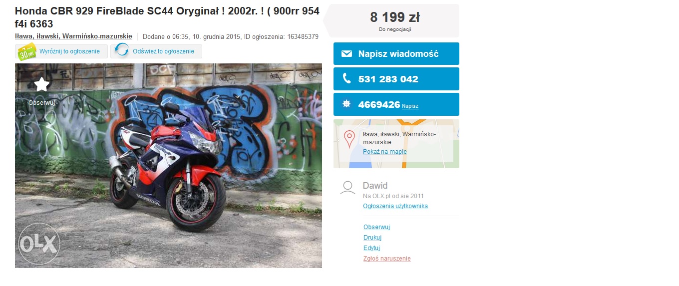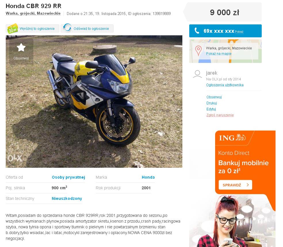 Witam to i ja może coś wniosę do tematu jakieś dwa miesiące temu byłem oglądać oto tą sztukę http://olx.pl/oferta/honda-cbr-929-fire ... 3858806426. Na zdjęcia wygląda bardzo przyzwoicie robione są tak, że nie ma do czego się przyczepić. Pofatygowałem się do typa 200KM. Przez telefon wszystko pięknie cacy luks malina. Na miejscu okazało się, że chłopak trzyma w garażu jeszcze kawe 636 do stuntu więc pewnie i ten dostał po pi***dzie co dało się zauważyć, ale do rzeczy. Ogon tylny popękany pod siedzeniem i nad tylną lampą porysowany, jak go odpalił to przy 40 stopniach temp roboczej silnika pokazywał jak pięknie odcina, liczne wyciecki z silnika spod pompy cieczy jak i z miski olejowej na co chłopak z tekstem, że tak można jeździć z ceny nie chciał nic opuścić ewentualnie 100zł i to jeszcze z wielkim bólem. Moto nawet nie przerejestrował od czasu zakupu, tylne wypełnienie ogonu cięte boschem i to jeszcze krzywo zostawiony kawałek aby tablice było do czego przykręcić, Owiewki silnika również porysowany jak i sam komin. Więcej nie pamietam bo generalnie nie było sensu się dłużej przyglądać owemu egzemplarzowi.