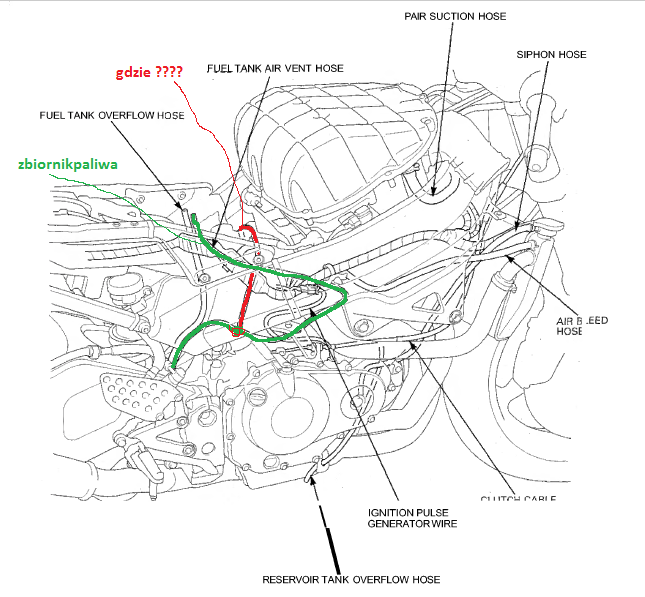 ponieważ lubię mieć wszystko zrobione tak jak się należy. Załączę zdjęcie z książki serwisowej na którym zaznaczyłem przewód podłączony do zbiornika paliwa (kolorem zielonym) , miejsce w którym znajduje się trójnik (czerwono zielony punkt) oraz przewód z którym to mam problem (kolorem czerwonym). Podczas podnoszenia zbiornika mogłem go przypadkowo odczepić , sam już nie wiem. Czy dysponuje ktoś wiedzą gdzie mam go podłączyć?