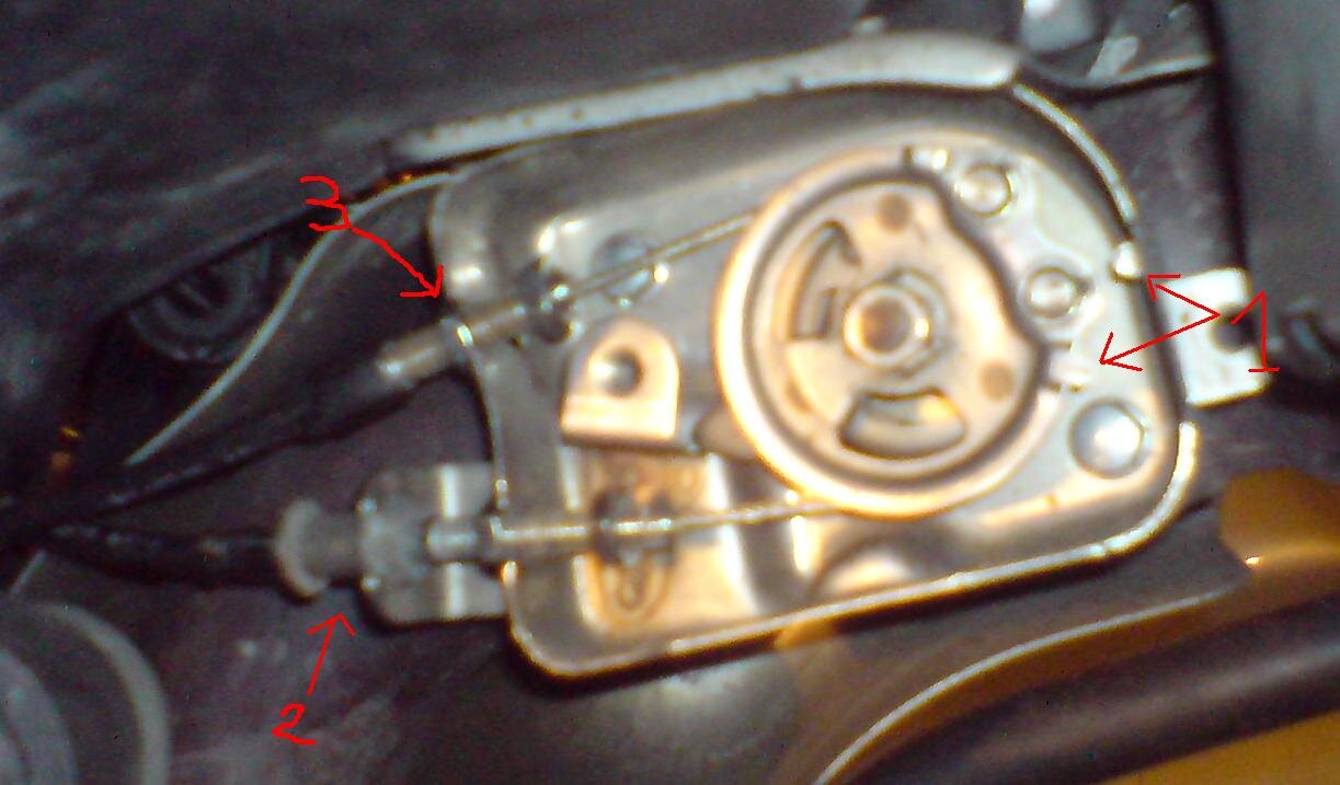 Pierwszy krok przy regulacji polegał na poluzowaniu obu śrubek z linki dolnej (tej ze sprężyną). Następnie zrobić zworkę. Myślę że w domniemaniu też włączyć zapłon i knefel na ON. Dalej poluzować dwie śruby (jedna w jedną druga w drugą) w drugiej lince. W miedzy czasie wyłączyłem zapłon żeby mi sie aku nie rozładował bo ta to troche trwało w takim zakamarku. Dalej trzeba jedną ze śrub regulować ustawienie kołowrotka do cechy na obudowie. I tutaj pojawia się problem. Skręciłem (a właściwie rozkręciłem) tą śrubę bardzo mocno (śrubka z numerem 3 na obrazku tak jak w serwisówce) i jest minimalna poprawa ale ciągle bardzo dużo brakuje!! (śrubka z numerem 3 na obrazku). Gdy włączyłem zapłon to aż servo zajęczało od napięcia tej linki (chcąc wrócić do poprzedniej, gorszej pozycji) i nie ruszało się. Dodam że sprężynka drugiej linki jest maksymalnie skręcona (2 na obrazku) mimo że są luzy na śróbkach. Gdzie robię błąd. Pomóżcie mi:(. Lubie sobie pomajsterkowac i chciałem to zrobić sam ale widać nawet w serwisówce nie ma tak łatwo opisane. POMOCY :(. Dlaczego serve ciągle chce obracać kołowrotek poniżej cechy a nie na nią (1 na obrazku) :(