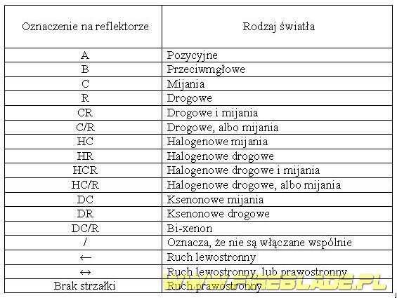 Tabela 2. Oznaczenia rodzaju świateł reflektora przedniego