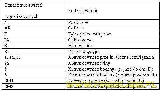 Tabela 2. Oznaczenia rodzaju świateł reflektora przedniego