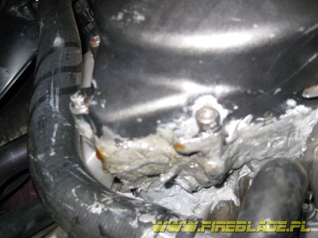 Jest tak "zarzygane" klejem, że jak tego nie oczyścisz to dokładnie nie zdiagnozujesz czy cieknie z dekla czy blok pęknięty!! Jeśli dekiel jest cały to blok pęknięty, a to już większy problem!!!