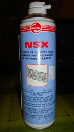 NSX jest środkiem na bazie PTFE przeznaczonym do smarowania łańcuchów o ściśniętych ogniwach, poddanych dużym obciążeniom i pracujących z dużą szybkością rotacyjną. Odporny na zalewanie wodą, także gorącą i słoną.