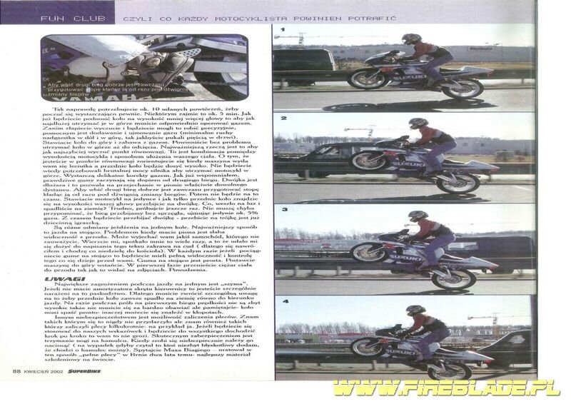 Cześć chłopaki. Wczoraj znalazłem swój zagubiony egzemplarz magazynu Superbike z kwietnia 2002 roku. Jest tam niezły artykuł odnośnie jazdy na kumie. A skoro sezon się zbliża to niejednemu z nas się przyda. Miłej lektury.