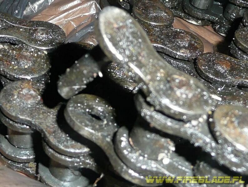 Jak zwykle same najgorsze przypuszczenia piszecie :P Spokojnie, nie jest tak źle. Motorek kupiłem w dobrym i zadbanym stanie. Napęd nie był umyty hehe, był i jest bardzo porządnie wysmarowany. Jego stan jest dobry oglądając zębatkę i naciąg łańcucha. Łańcuch to did 50vm, czyli dobry wzmacniany łańcuch, nigdzie nie spawany. Niestety jak widać nie był profesjonalnie zakuty :/ Tutaj lipa i niestety puścił na łączeniu. Poprzednik chciał dobrze ale albo mu nie wyszło albo mu się nie chciało i zrobił na odwal bo wiedział że i tak sprzeda. Ale po za tym naprawdę jest ok :) Fakt, dobrze że stało to się na prostej. Może i lipa że w ogóle się to stało, ale przynajmniej teraz jak zrobię będę pewny że takie coś nie będzie miało drugi raz miejsca. Piszecie że nowe ogniwo i zakuć. Też myślę że to nie jest zły pomysł, jeśli zrobi to się profesjonalnie a nie "młotkiem" ;) to powinno być ok :) U mnie właściwie będą potrzebne 2 nowe ogniwa, a te stare wywalić. Zamieszczam fotki łańcucha, obejrzyjcie to sobie dokładnie :) Niby poszło na łączeniu, ale na jednym zdjęciu 2 ogniwa trochę się różnią od innych, trochę coś mi tutaj śmierdzi, czy to też nie jest czasem jakaś złączka ? Piszcie co robić i skąd wziąć ogniwa do tego łańcucha :) I czy dać to do mechanika który ma dobrą zakuwarkę czy może zainwestować w taki sprzęt to i na przyszłość się przyda ? :)