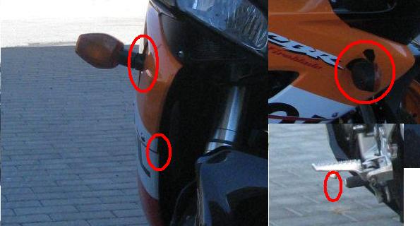 Brak śrub w podnóżkach. Plastik mocowania kierunkowskazu pęknięty i źle spasowane boki a raczej odkształcone po upadku :)